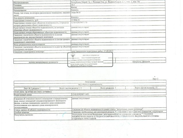 Данные получены с сайта ГИС Торги. Комната площадью 16,5 кв.м., расположенная по адресу: РМЭ, г. Йошкар-Ола, ул. Йывана Кырли, д.1, пом.1, ком.116. кад.12:05:0202007:1403. Комната с бременем залога в пользу ПАО "Совкомбанк" (организатор торгов информацией о задолженности должника не располагает (судебным приставом-исполнителем не предоставлены),