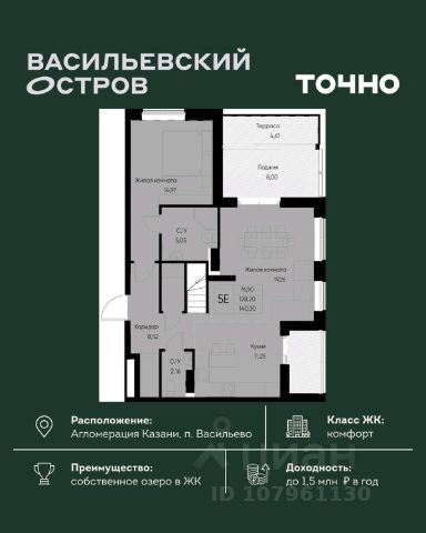Продается 1-комн. квартира на 3-м этаже в строящемся проекте GloraX Экосити. Общая площадь лота составляет 46,38 кв. м, из которых 13,67 кв. м отведено под жилую и 16,99 кв. м под кухонную зону. Номер квартиры - 17