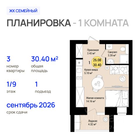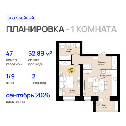 Продаётся 1-комнатная квартира в строящемся доме (Позиция 9 (1 этап)), срок сдачи: III-кв. 2026, общей площадью 52.89 кв.м., на 1 этаже. Новый жилой комплекс "Семейный" от застройщика "Росагрострой" расположен по адресу: Республика Марий Эл, г. Йошкар-Ола, с. Семеновка, ул. Молодежная. "Семейный" - это комплекс из 5 многоквартирных домов на 1500 квартир. На обширной территории ЖК запланировано построить детский сад на 320 мест и школу на 550 мест. Для возведения домов используется силикатный кирпич, предусмотрено остекление лоджий. На официальном сайте жилого комплекса открыты продажи квартир в первом доме. Продуманные планировки в "Семейном" включают евроквартиры с просторными гостиными, а также гардеробными. Высота потолков 2.7 м. На территории ЖК запроектирована вместительная парковка на 3000 мест. Для прогулок во дворе будет обустроена спортивная и детская площадки, а также места отдыха для всей семьи.