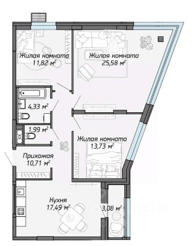 ванная 3, 0 кв. м. , туалетная комната - 2, 4 квм.