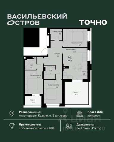 ЖК "Васильевский остров" — масштабный проект ТОЧНО в Казанской агломерации. Просторная территория 88 Га спроектирована для комфортной жизни: озеро с набережной и пляжем, каток, зелёные маршруты. В проекте комплекса — школа на 1 224 места, 2 детских сада на 680 мест, детская и взрослая поликлиники, фитнес-центр с бассейном, термальный комплекс, фермерский рынок, магазины, кафе и рестораны.