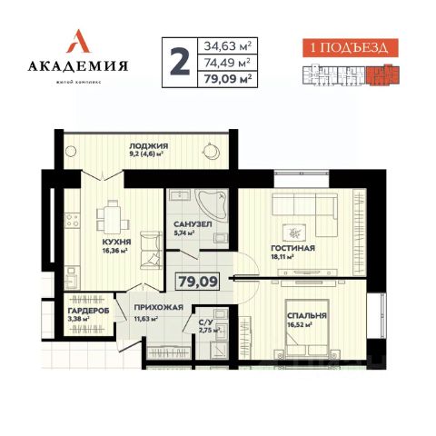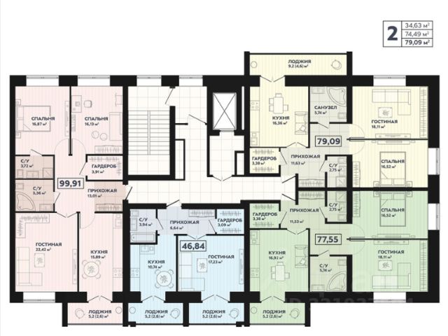 Просторная 2-комнатная квартира общей площадью 47,8 кв.м.