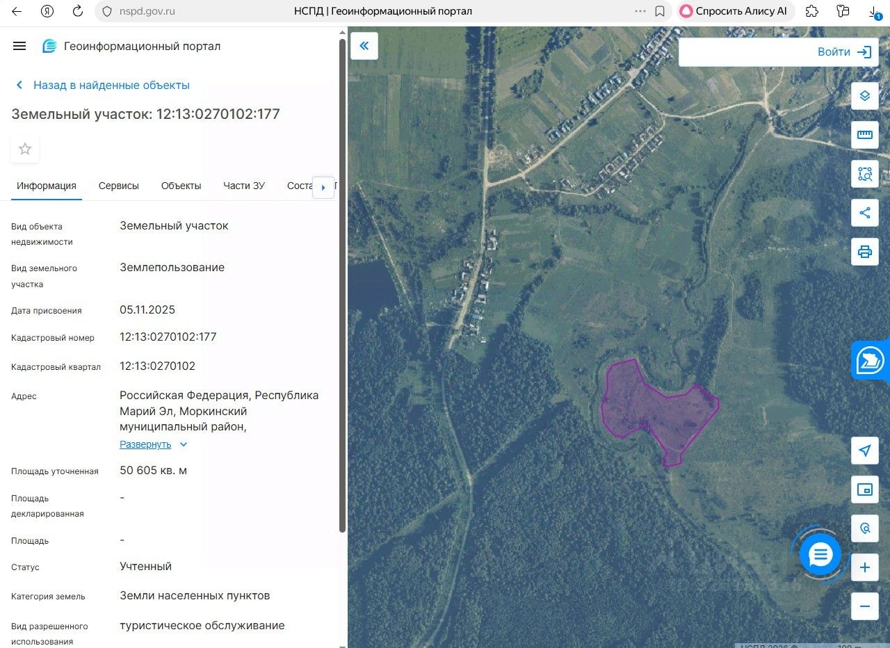 Земельный участок с кадастровым номером 12:13:0270102:177 площадь 50605 по адресу Российская Федерация, Республика Марий Эл, Моркинский муниципальный район, Семисолинское сельское поселение, д. Алмаметьево