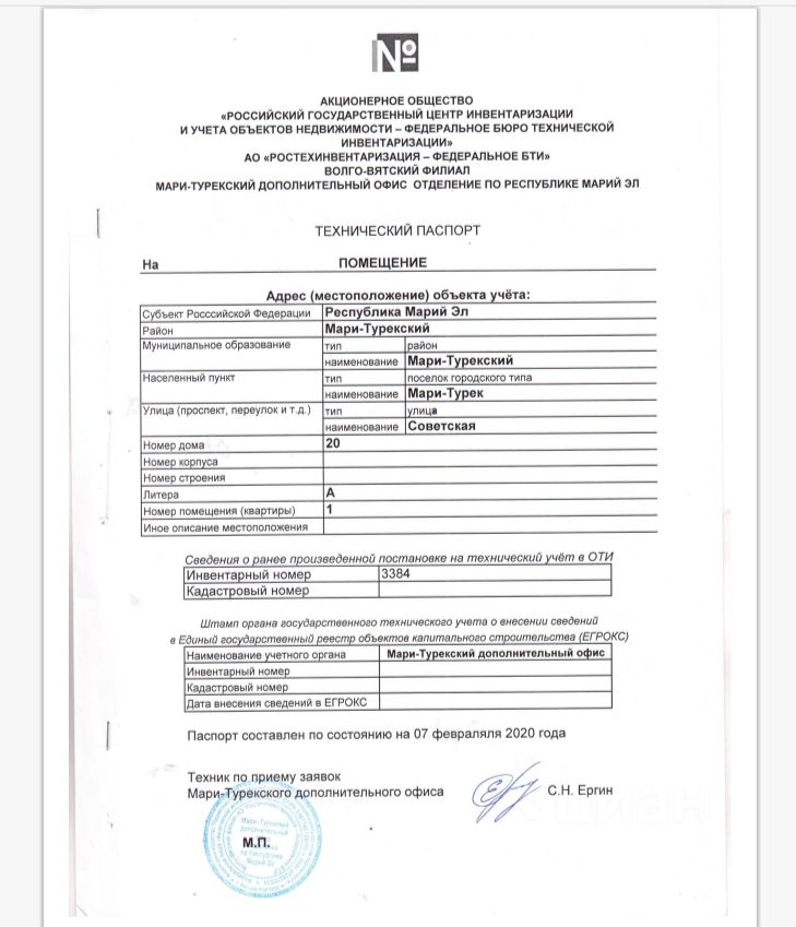 Нежилое помещение, расположенное по адресу: Республика Марий Эл, Мари-Турекский район, пгт. Мари-Турек, ул. Советская, д. 20, помещение 1, этаж 1, общая площадь 9,9 кв. м.