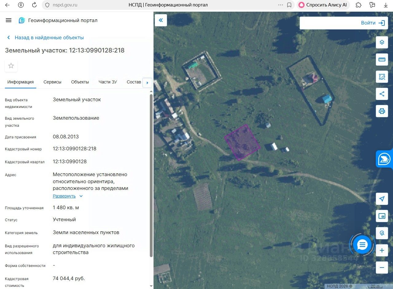 Земельный участок с кадастровым номером 12:13:0990128:218 площадь 1480 по адресу Республика Марий Эл, р-н Моркинский, пгт Морки, ул Солнечная, д 11