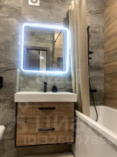 - ванная в современном стиле и зеркалом с подсветкой.