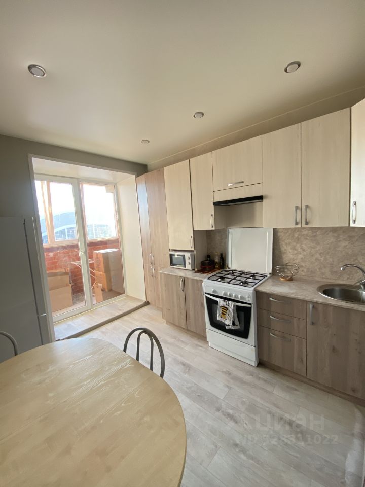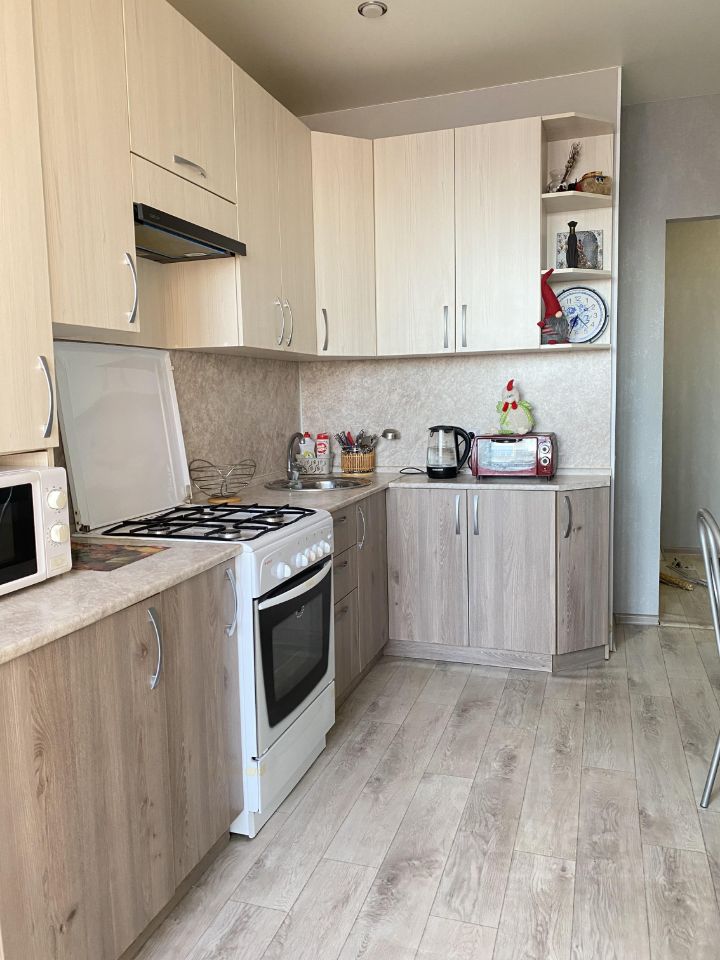 Кухня оснащена техникой (плита, холодильник, микроволновка).
