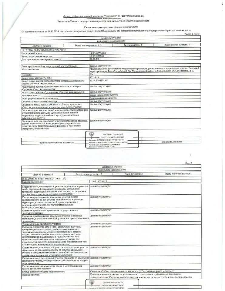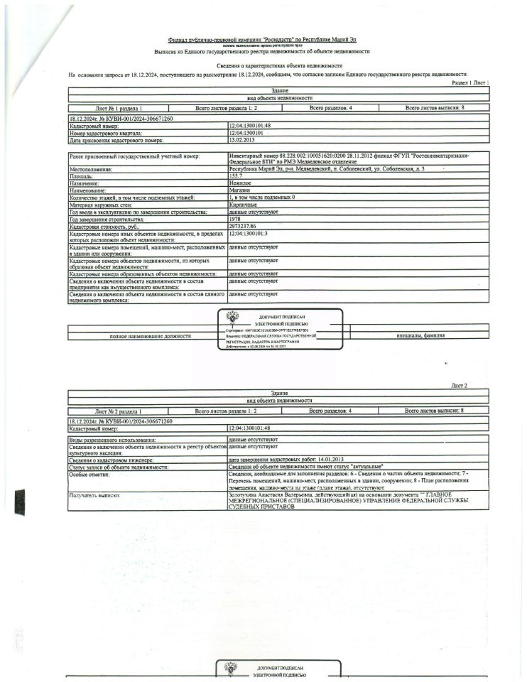 Земельный участок для размещения магазина пл. 224,00 кв.м., кад.12:04:1300101:3, Здание нежилое пл.155,7 кв.м., кад. 12:04:01300101:48 (крыша здания повреждена, имеются трещины в кирпичной смене), расположенные по адресу: РМЭ, Медведевский район, п.Соболевский, ул. Соболевская, д.3, должник ПК "Медведевское РАЙПО".