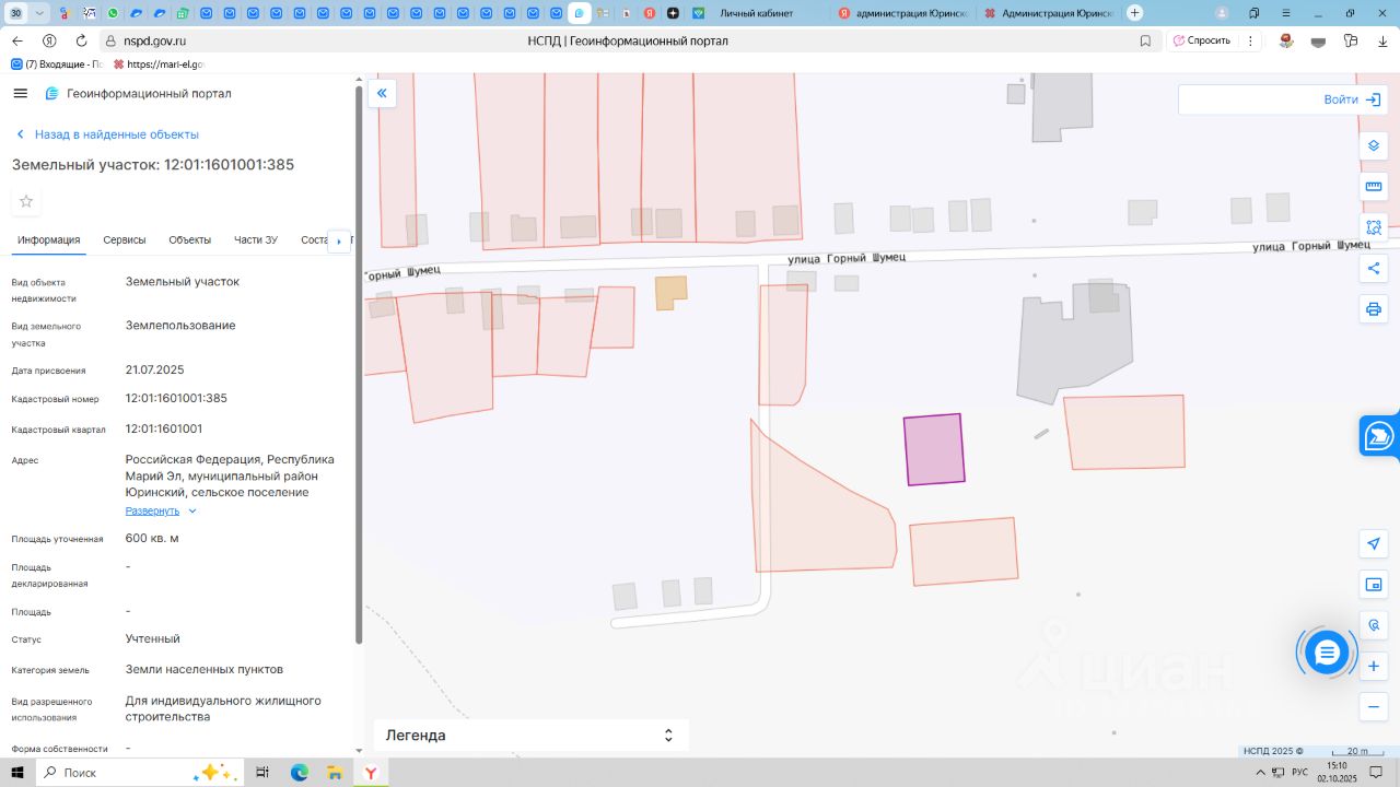 Земельный участок из категории "Земли населенного пункта" с кадастровым номером 12:01:1601001:385, расположенный по адресу: Республика Марий Эл, Юринский район, д.ГорныйШумец, земельный участок 40а, вид разрешенного использования: для индивидуального жилищного строительства, общей площадью 600,0 кв.м