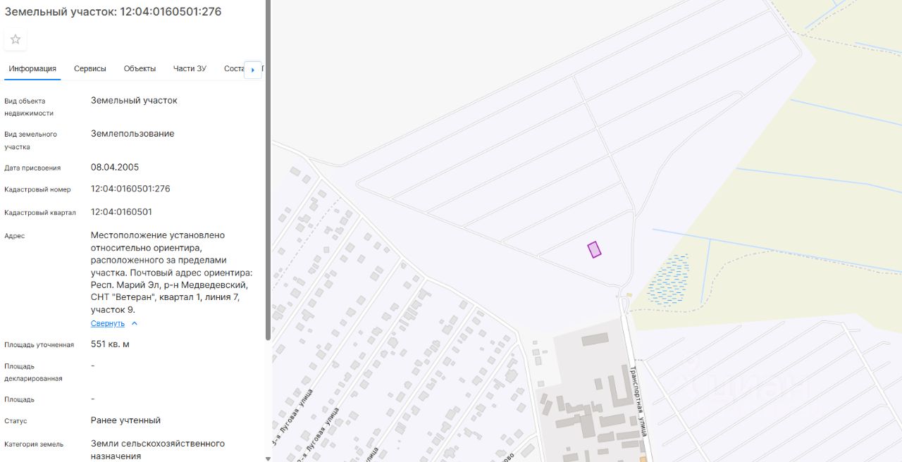 земельный участок, с кадастровым номером 12:04:0160501:276, категория земель земли сельскохозяйственного назначения, разрешенное использование для садоводства, площадью 551 кв. м., расположенный по адресу: Республика Марий Эл, Медведевский муниципальный район, Пекшиксолинское сельское поселение, Медведевский район, СНТ "Ветеран", квартал 1, линия7, участок9