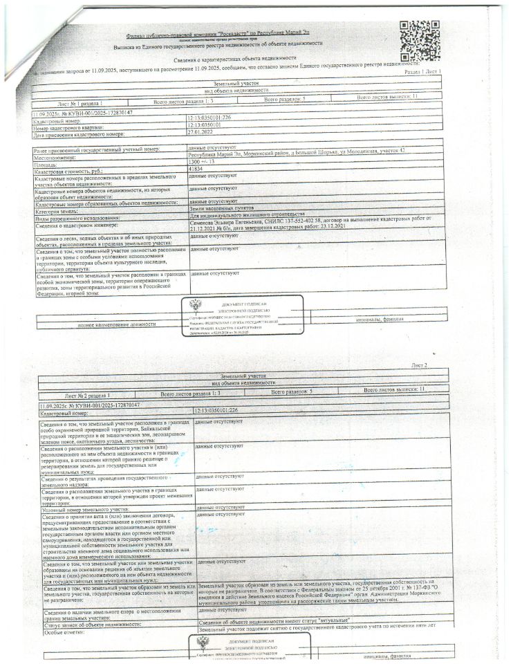 Земельный участок для индивидуального жилищного строительства площадью 1300 кв.м., кадастровый номер 12:13:0350101:226, расположен по адресу: РМЭ, Моркинский район, д. Большой Шоръял, ул. Молодежная, участок 42, должник Жарова Л.И.
