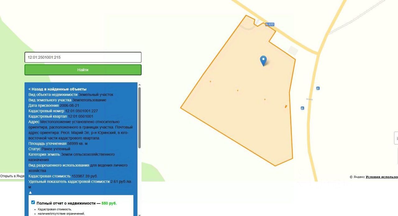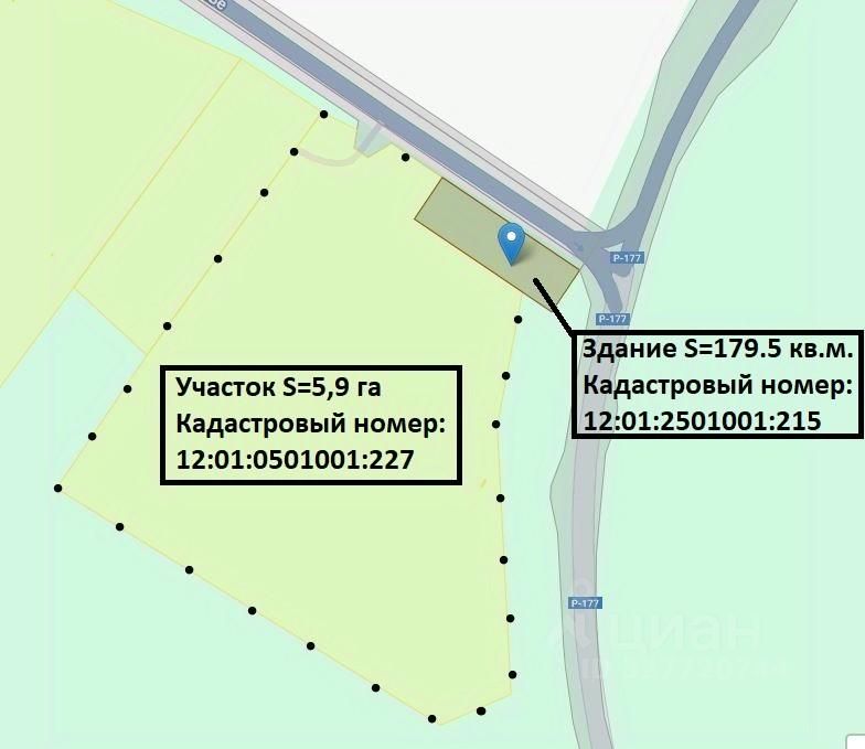 Участок правильной формы площадью 5,9 га. Кадастровый номер 12:01:0501001:227На территории участка располагается нежилое здание площадью 179,5 кв. м, кадастровый номер 12:01:2501001:215. Земли промышленного назначения. Наличие подключения к электричеству.