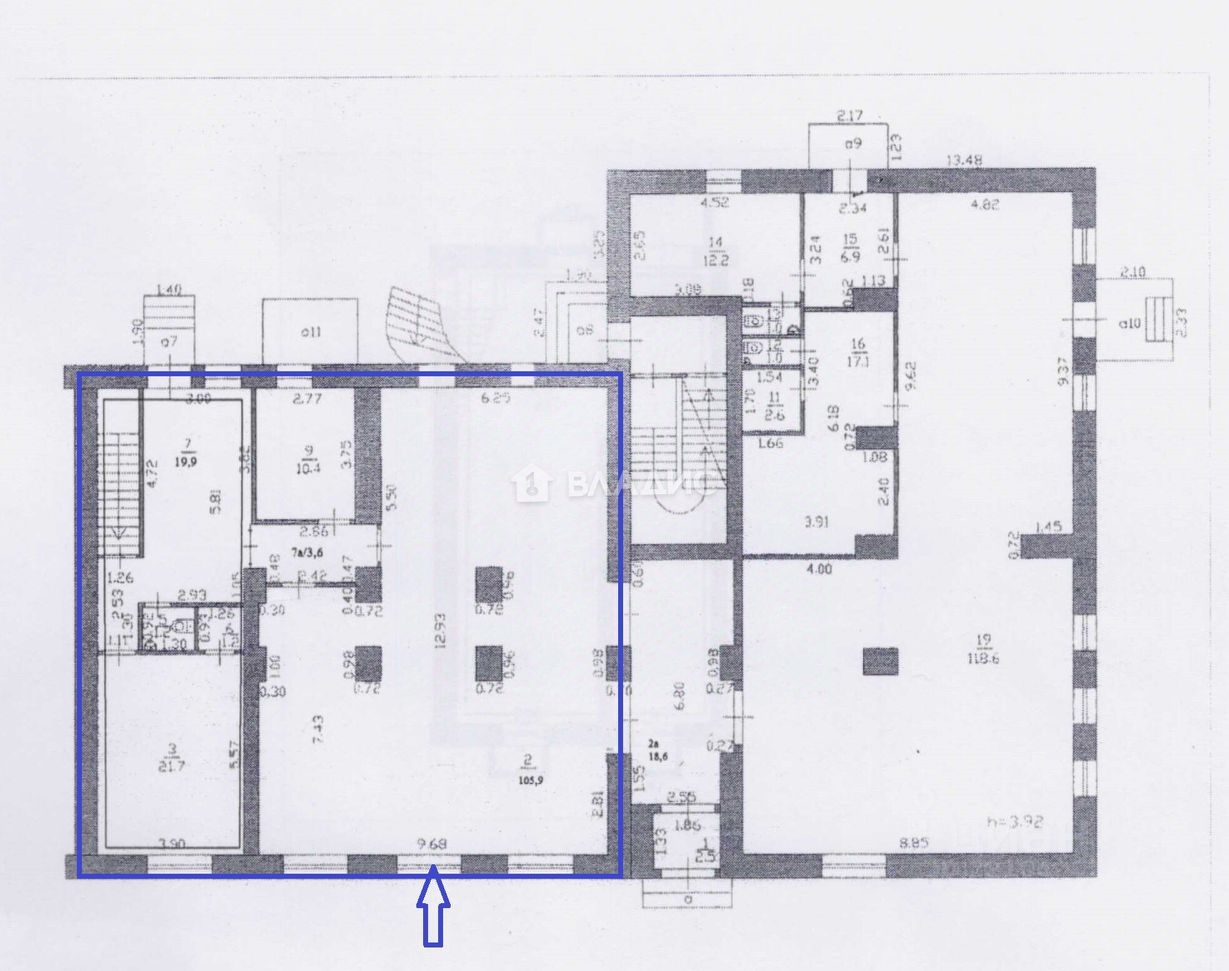 Состоит из 1 этажа площадью 165 кв.м. (120+45) и подвала площадью 87 кв.м.