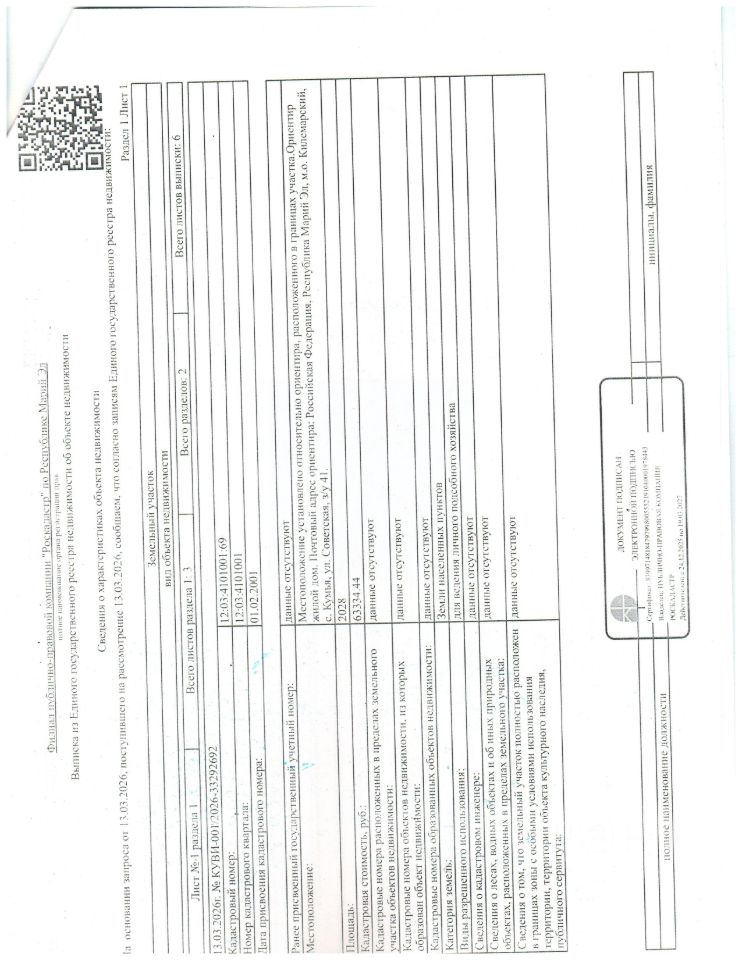 Земельный участок, расположенный по адресу: РМЭ, Килемарский р-он.,с. Кумья, ул. Советская, д. 41, площадь-2028,00 кв.м., кадастровый номер: 12:03:4101001:69, принадлежащий должнику Николаеву И.А.