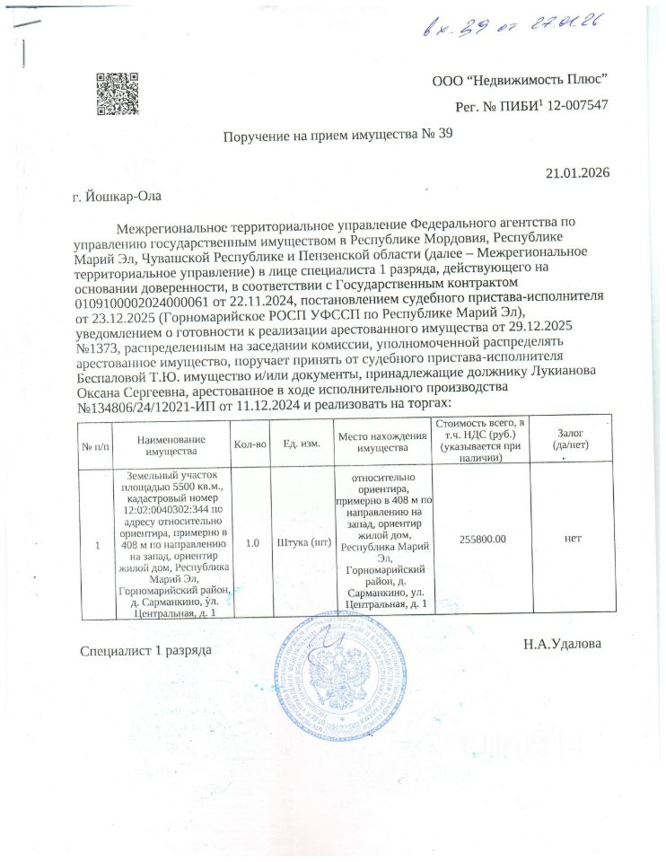 Земельный участок площадью 5500 кв.м., кадастровый номер 12:02:0040302:344 расположенный по адресу относительно ориентира: примерно в 408 м по направлению на запад, ориентир жилой дом, Республика Марий Эл, Горномарийский район, д. Сарманкино, ул. Центральная, д. 1, должник Лукианова О.С.