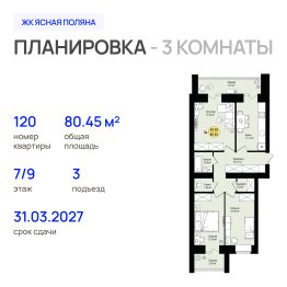 Продаётся 3-комнатная квартира в строящемся доме (Позиция 1 (1 этап)), срок сдачи: III-кв. 2026, общей площадью 80.45 кв.м., на 7 этаже. Новый жилой комплекс "РАС Ясная Поляна" от Специализированного застройщика "Русагрострой" расположен по адресу: г. Йошкар-Ола, ул. Козьмодемьянский тракт.