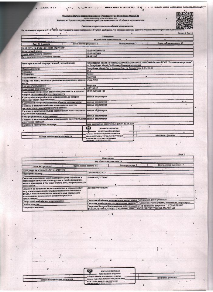 Жилое помещение площадью 35,6 кв.м., кад. 12:05:0403003:423, расположенное по адресу: РМЭ, г. Йошкар-Ола, ул. Лермонтова, д.31, кв.22, должник Пушкин С.В. (организатор торгов сведениями о зарегистрированных в жилом помещении лицах/ информацией о задолженности должника по взносам на капитальный ремонт не располагает (судебным приставом-исполнителем не предоставлены). Является заложенным в пользу ПАО "АК БАРС" Банк.