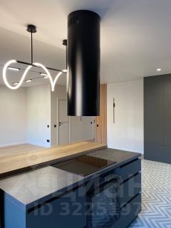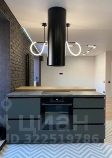 Встроенная кухня с техникой: духовой шкаф, посудомоечная машина, холодильник, индукционная плита, островная вытяжка.