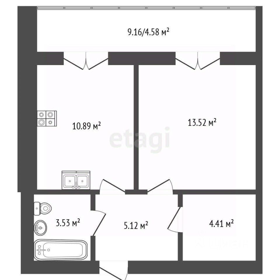 Общая комната 13.52, просторная кухня 11 квадратов.