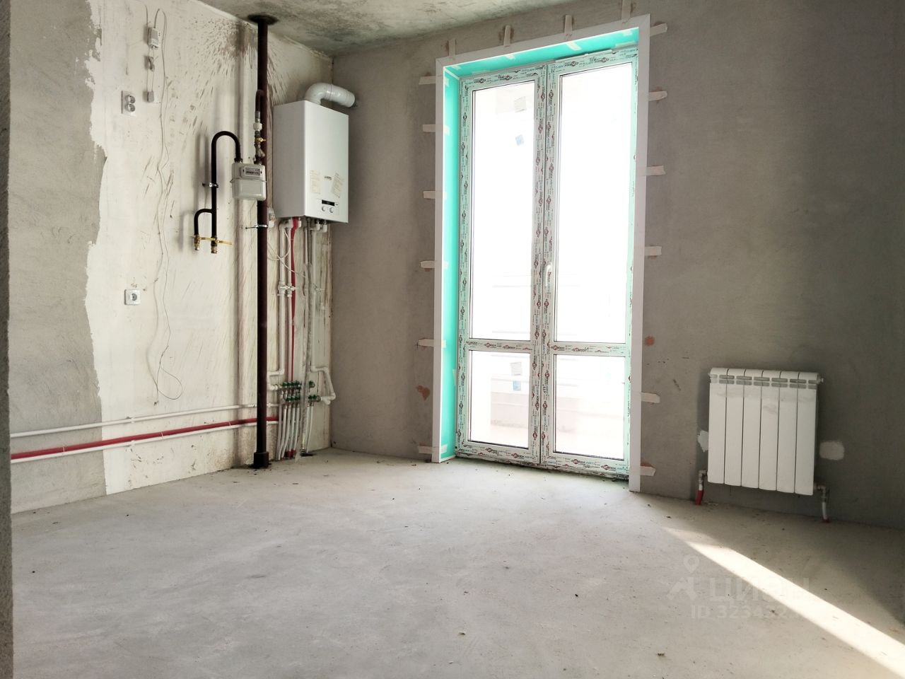 пол - чистовая стяжка, потолочные швы выровнены, черновая штукатурка, электропроводка, газовый котел, радиаторы отопления
