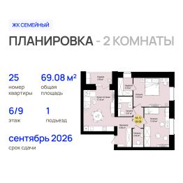 Продаётся 2-комнатная квартира в строящемся доме (Позиция 9 (1 этап)), срок сдачи: III-кв. 2026, общей площадью 69.08 кв.м., на 6 этаже. Новый жилой комплекс "Семейный" от застройщика "Росагрострой" расположен по адресу: Республика Марий Эл, г. Йошкар-Ола, с. Семеновка, ул. Молодежная.