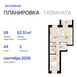 Продаётся 1-комнатная квартира в строящемся доме (Позиция 9 (1 этап)), срок сдачи: III-кв. 2026, общей площадью 62.51 кв.м., на 4 этаже. Новый жилой комплекс "Семейный" от застройщика "Росагрострой" расположен по адресу: Республика Марий Эл, г. Йошкар-Ола, с. Семеновка, ул. Молодежная.