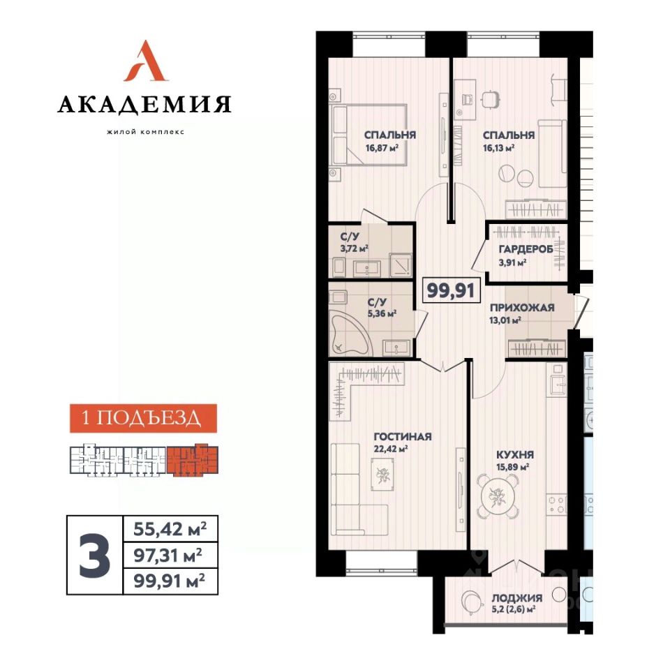 Продаётся 3-комнатная квартира в сданном доме (Красноармейская, 52 (Поз. 24)), срок сдачи: I-кв. 2025, общей площадью 99.91 кв.м., на 5 этаже. Новый жилой комплекс от специализированного застройщика "СтройИнвест" расположен в г. Йошкар-Ола по ул. Красноармейская.