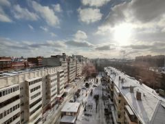 Федеральная компания Этажи представляет вашему вниманию уютную двухкомнатную квартиру в самом центре нашего города. Квартира расположена в новом доме на верхнем этаже. Планировка самая удачная - распашная. Два больших раздельных санузла - более 3 метров каждый. Кухня 15 квадратных метров, спальня и гостиная 16 и 18 метров соответственно - хорошие размеры комнат правильной формы. Кухня и гостиная имеют выходы на отдельные лоджии. Через высокие панорамные "французские" окна открывается отличный вид на город.