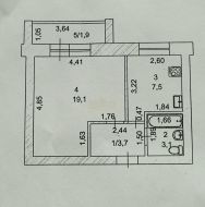 -Комната 19.1 кв.м.правильной формы( удобно будет расставить мебель, кухня 7.5кв.м. под кухонный гарнитур установлен фартук, совместный санузел 3,1кв м., есть все счетчики учета.
