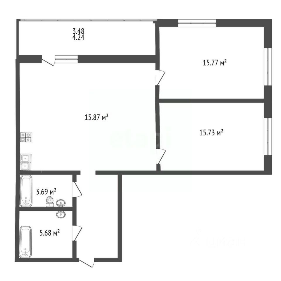 Общая площадь: почти 92 кв.м. Удобная распашная планировка, просторная кухня-гостиная -33 кв.м. , раздельный санузел, 2 спальные комнаты - по 15,57кв.м., застекленная лоджия - 8 кв.м. с выходом из кухни.