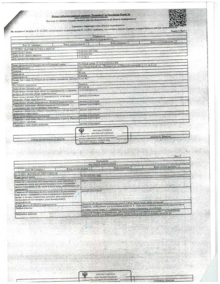 Жилое помещение, площадь 12,7 кв.м., кад. номер 12:05:0301003:1062, расположенное по адресу: РМЭ, г. Йошкар-Ола, ул. Машиностроителей, д. 112, к. 5, кв. 2, принадлежащее должнику Смирновой С.А. (организатор торгов сведениями о зарегистрированных в жилом помещении лицах/ информацией о задолженности должника по взносам на капитальный ремонт не располагает (судебным приставом-исполнителем не предоставлены).