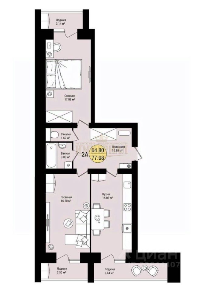 общая площадь: 77,08 м2;