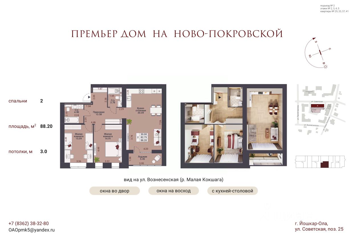 Продаётся 2-комнатная квартира в строящемся доме (Позиция 25), срок сдачи: III-кв. 2028, общей площадью 88.2 кв.м., на 2 этаже. Премьер-дом "5 звезд на Ново-Покровской" - новый проект компании "ПМК-5", расположенный по адресу: Марий Эл, г. Йошкар-Ола, ул. Советская.