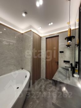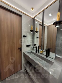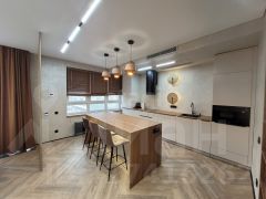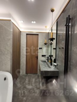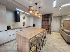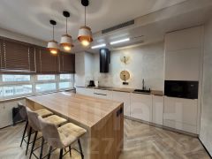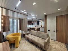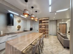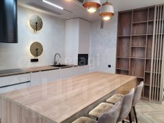 Отделка выполнена из качественных материалов: натуральное дерево, керамогранит, фактурная штукатурка. Пространство наполнено светом благодаря французским окнам, а натяжные потолки со встроенными светильниками создают современную и уютную атмосферу. Климат-контроль обеспечивают сплит-система кондиционирования, напольные конвекторы и радиаторы нового поколения. Вся мебель изготовлена на заказ с учетом особенностей помещения. Ванная комната выполнена в керамограните, дизайнерские светильники из мрамора задают стиль этой квартиры.