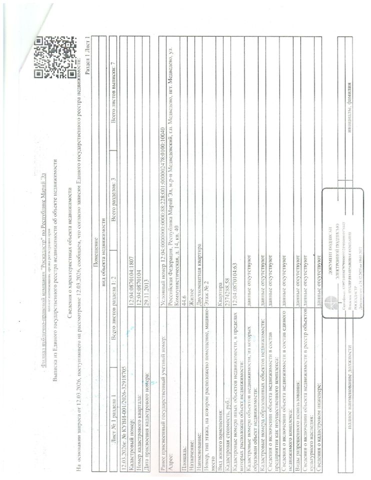 Квартира площадью 44,6 кв.м., расположенная по адресу п. Медведево ул. Коммунистическая д.14 кв.40., кад. 12:04:0870104:1807, принадлежащая должнику Пермякову Д.В. (организатор торгов сведениями о зарегистрированных в жилом помещении лицах/ информацией о задолженности должника по взносам на капитальный ремонт не располагает (судебным приставом-исполнителем не предоставлены).