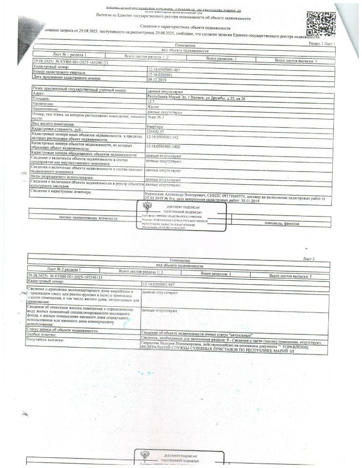 Жилое помещение, 12,70 кв.м., расположенное по адресу: РМЭ, г.Волжск, ул. Дружбы, д.25, кв.26, кад 12:16:0505001:467, принадлежащее Корнилаеву А.А (организатор торгов сведениями о зарегистрированных в жилом помещении лицах/ информацией о задолженности должника по взносам на капитальный ремонт не располагает (судебным приставом-исполнителем не предоставлены)