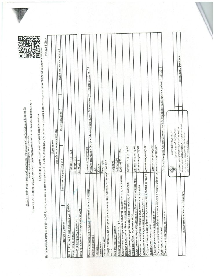 Жилое помещение квартира, площадью 33.60 кв.м., расположенное по адресу: Республика Марий Эл, р-н. Медведевский, пгт. Медведево, ул. Чехова, д. 27, кв. 27. кад. 12:04:0870101:724, принадлежащая должнику Токманову В.В. (организатор торгов сведениями о зарегистрированных в жилом помещении лицах/ информацией о задолженности должника по взносам на капитальный ремонт не располагает (судебным приставом-исполнителем не предоставлены). Помещение с бременем залога в пользу ПАО Сбербанк России (организатор торгов информацией о задолженности должника не располагает (судебным приставом-исполнителем не предоставлены).